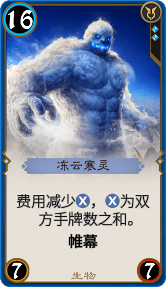 極地的神秘生物總是令人意外,當(dāng)冬擁騎士團的斥候首次遭遇凍云寒靈時,深深被其龐大而毀滅性的力量震撼。這種生物絕非易于對付的存在。它出現(xiàn)在《秘境對決》中的一張藍色生物卡片上。