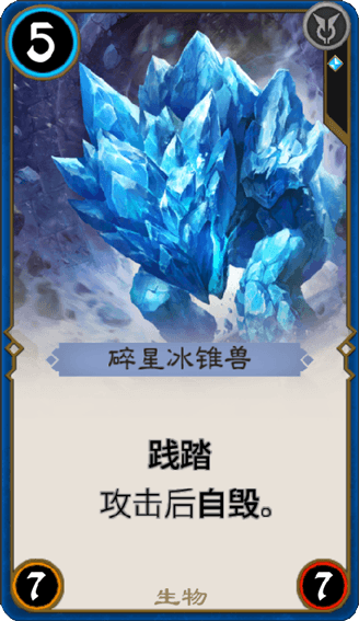 碎星冰錐獸以其強(qiáng)大的破壞力著稱,它那猛烈的撞擊可以輕松摧毀城門。雖然它像是一種一次性兵器,通常只需要沖擊一次便會(huì)徹底解體,但5費(fèi)7/7的身材依舊讓人印象深刻。這張卡片出現(xiàn)在《秘境對(duì)決》中,屬于藍(lán)色生物卡。