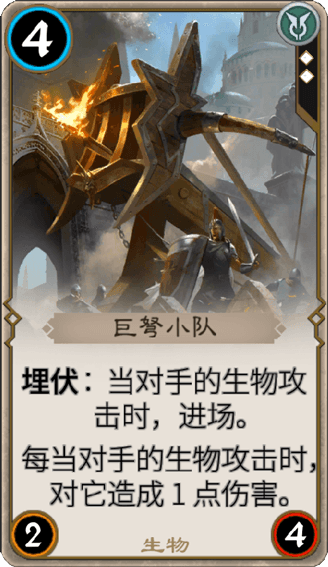 | 埋伏:當(dāng)敵方生物進(jìn)行攻擊時(shí),巨弩小隊(duì)便會(huì)進(jìn)入戰(zhàn)場(chǎng)。每當(dāng)敵人攻擊時(shí),對(duì)其造成1點(diǎn)傷害。 | |