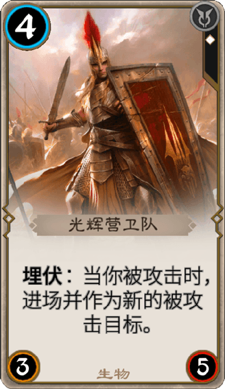 光輝營衛(wèi)隊(duì)并不算是頂尖的精英部隊(duì),但在面對生死存亡的時(shí)刻,他們對守護(hù)家園的決心會(huì)使他們的戰(zhàn)斗力成倍增長。對他們來說,唯有全力以赴,永不退縮。光輝營衛(wèi)隊(duì)是《秘境對決》中的一張生物卡。