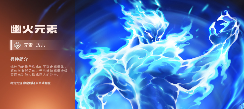 由純能量構(gòu)成的不穩(wěn)定能量體,一旦軀體破裂,其內(nèi)部的能量便會(huì)外泄,造成強(qiáng)烈的沖擊力。幽火元素是一個(gè)可靠的輸出單位,其灼燒效果可以提供可觀的持續(xù)傷害,且死亡后仍能對(duì)敵方全體造成一次高額傷害,并附帶灼燒效果。隨著戰(zhàn)斗進(jìn)行,幽火元素的技能使其越戰(zhàn)越強(qiáng)。