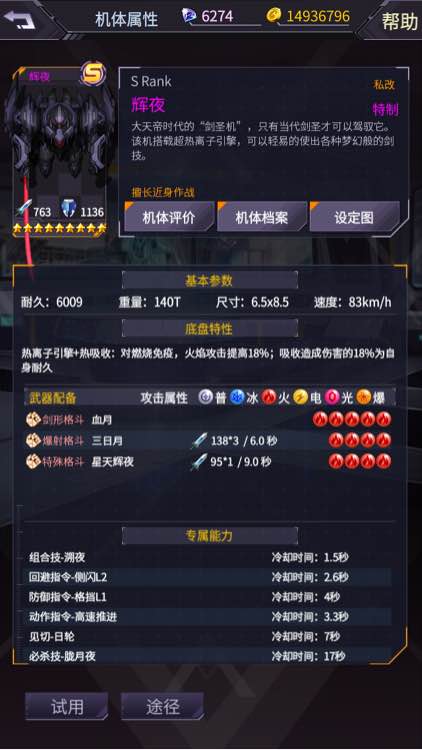 “大天帝時代”的“劍圣機”是一款只能由當(dāng)代劍圣操控的強力戰(zhàn)機。它配備了超熱離子引擎,能夠輕松施展出一系列令人嘆為觀止的劍技。輝夜作為現(xiàn)階段最強大的PY機,具備極為流暢的動作和驚人的輸出火力。如果它的生存能力能有所提升,幾乎可以稱得上無敵。