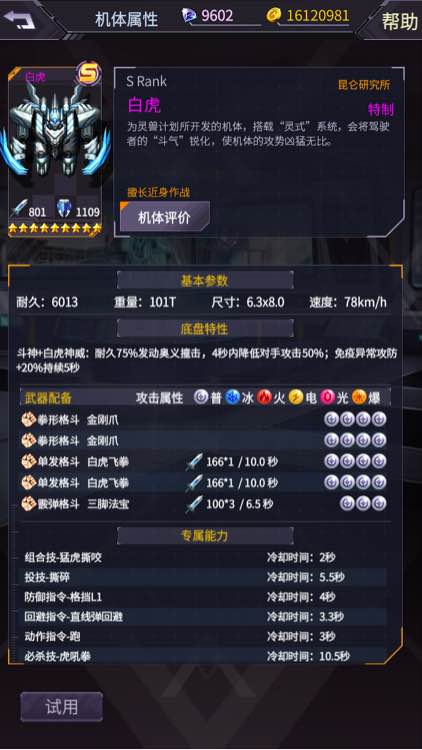 該機(jī)體是為靈獸計(jì)劃而專門研發(fā)的,搭載了“靈式”系統(tǒng),能夠強(qiáng)化駕駛員的斗氣,使得機(jī)體的攻擊力極為強(qiáng)大。原本被視為四神獸之一的白虎,曾因表現(xiàn)不佳而被詬病,但經(jīng)過改良后的白虎憑借著卓越的連貫性動(dòng)作、出色的機(jī)動(dòng)性和強(qiáng)大的輸出,成功找回了在四神獸中的地位,贏得了許多玩家的青睞。