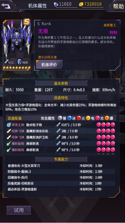 作為高橋重工的三大謎團(tuán)之一,至今沒(méi)有人能解釋為什么這臺(tái)機(jī)體每次投入戰(zhàn)斗時(shí),所發(fā)射的浮游炮數(shù)量總是超出其原本搭載的數(shù)量。浮游機(jī)目前在游戲版本中遭遇了極大的制約,盡管曾一度輝煌,但在版本的壓制下,它們只能無(wú)奈地被收回倉(cāng)庫(kù),成為擺設(shè)。玩家只能期待某一天,浮游機(jī)能再次迎來(lái)它的輝煌時(shí)刻。