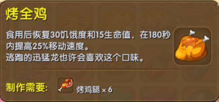 在《迷你世界》這款游戲中,烤全雞是一個非常有趣的合成食材。玩家通過將6個雞腿合成一只烤全雞,這可不是普通的雞肉!吃下它不僅能夠恢復(fù)30點饑餓值,還能恢復(fù)一定的生命值。從文字描述來看,迅猛龍似乎也對這種“六腳雞”情有獨鐘。