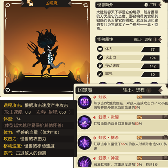 “大肚能容天下事”展現(xiàn)了它的寬廣胸懷,而隨身攜帶的刀叉則代表了它的獨(dú)特風(fēng)格。那根能夠敏銳感知美食的長(zhǎng)舌,是它驕傲的象征,仿佛一切都能被它吞噬殆盡。作為一只強(qiáng)力輸出的怪獸,兇噬魔不僅具備極強(qiáng)的攻擊能力,生存能力同樣不容小覷。