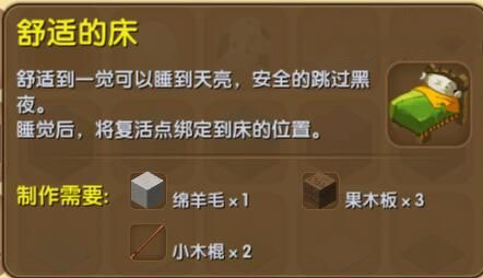 在《迷你世界》中,舒適的床是一個(gè)至關(guān)重要的物品。它不僅可以幫助玩家迅速進(jìn)入夢(mèng)鄉(xiāng),躲避黑夜的危險(xiǎn),更關(guān)鍵的是,使用過(guò)床后,復(fù)活點(diǎn)將會(huì)綁定在床上,成為玩家在游戲中的新的出生地點(diǎn),因此可以說(shuō)是必須要制作的道具。