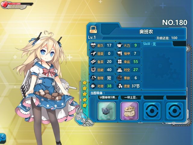奧班農(nóng)曾在2015年的中間島活動(dòng)中作為限定艦船出現(xiàn),之后就無(wú)法通過(guò)常規(guī)途徑獲得。當(dāng)時(shí),許多紳士們?yōu)榱藫频竭@艘“土豆”船,不惜花費(fèi)大量資源,結(jié)果卻得到許多其他的大船,其中關(guān)島等大船讓玩家們紛紛感到有些失望。盡管奧班農(nóng)具有較高的閃避和52的幸運(yùn)值,但她的實(shí)際戰(zhàn)斗價(jià)值并不高。未改造狀態(tài)下,她沒(méi)有中破保護(hù),因此很難在戰(zhàn)斗中發(fā)揮作用。她自帶的紫色裝備“一袋土豆”提供+3反潛和+3幸運(yùn),雖然有些玩家認(rèn)為這是一種有趣的反潛裝備,但更像是在調(diào)侃玩家的幽默設(shè)計(jì)。