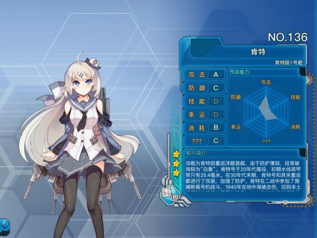 肯特號是肯特級的首艦,稀有度為三星,實際為六星艦,屬于小歐證艦之一,建造限定,出貨率極低。她與博格、追趕等艦船一樣,出自同一個制作人Rain,因此她的立繪也異??蓯?。臺詞里多次提到自己的裝甲薄弱,所以在許多紳士眼中,肯特幾乎就像沒穿衣服一樣,至少上下似乎都很裸露。此外,她的屬性相當弱,而且消耗較大,導致她被稱作“白象”(White Elephant),意指貴重但無用之物。無論是改造前后,都能明顯看出她是個擁有隱藏大胸的艦船;改造后,她還獲得了LO娘風格的寬邊蓬蓬袖和大蝴蝶結,整體形象變得更加萌化。重巡艦果然命中注定要成為偶像!此外,曾經在二設中,她與昆西昆合體成為“昆特”,不過隨著真?昆特(見No.237薩福克)的實裝,這個梗也逐漸退出了歷史舞臺。