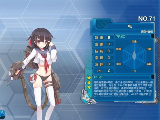 與其他六驅(qū)艦船類似,電從2圖開始掉落,萌新玩家通常會(huì)在2-4圖中撈到她。撈到后可以將她培養(yǎng)成主力小學(xué)生,但激活她的技能并不是迫切的優(yōu)先任務(wù)。