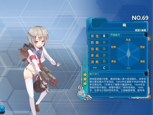 今天為大家?guī)淼氖恰稇?zhàn)艦少女r》中響號艦船的評測。她是那種總是露著內(nèi)褲的小學(xué)生,實(shí)在是有些讓人忍俊不禁,改造后雖然裙子遮住了內(nèi)褲,看起來更為端莊,但還是讓人覺得有些弱弱的感覺,十分可愛。她的實(shí)力也是游戲中幾個(gè)核心小學(xué)生之一,作為新手玩家,拿到她之后一定要盡快培養(yǎng)起來。
