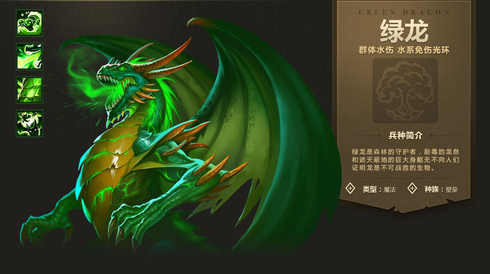 | 技能描述 | 綠龍能免疫“流血”與“疾病”效果,并提高全體友軍兵團(tuán)15%的水系法術(shù)免傷。 | |||||