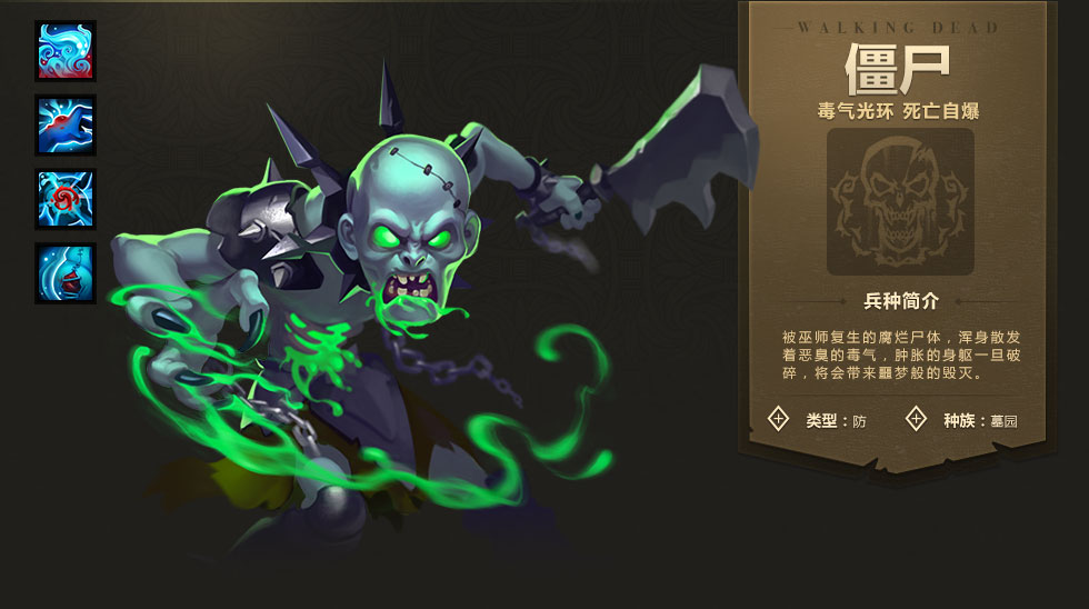 僵尸是那些經(jīng)過巫術(shù)復(fù)生的腐爛尸體,它們散發(fā)著難聞的毒氣,身體膨脹,一旦破裂將會引發(fā)毀滅性的后果。不要被僵尸看似脆弱的外表所迷惑,它們的真正威脅來自于死亡。讓我們一起來了解僵尸的技能和屬性。