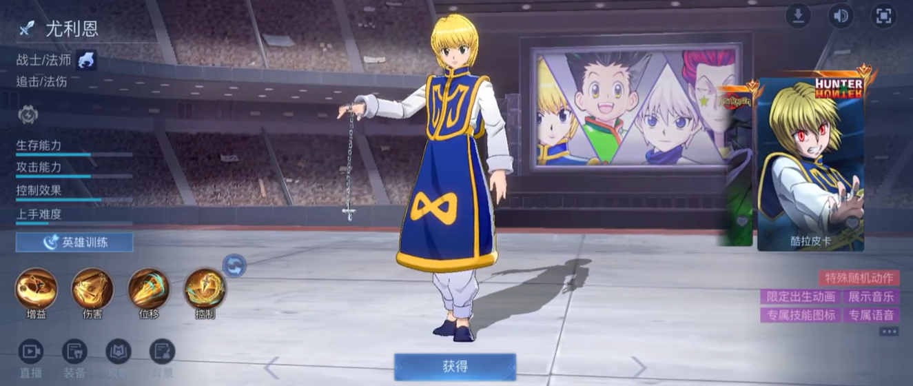 接下來(lái)是酷拉皮卡主題皮膚,這次為尤利恩帶來(lái)了一個(gè)極具震撼力的新特效。酷拉皮卡標(biāo)志性的金色鎖鏈效果被完美呈現(xiàn),簡(jiǎn)直是讓人看了就心生贊嘆。而每次擊敗敵人后,還會(huì)出現(xiàn)獨(dú)特的KO字樣,仿佛每次勝利都得到了酷拉皮卡的榮耀加持。酷拉皮卡的粉絲們,一定不要錯(cuò)過(guò)這款皮膚!