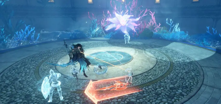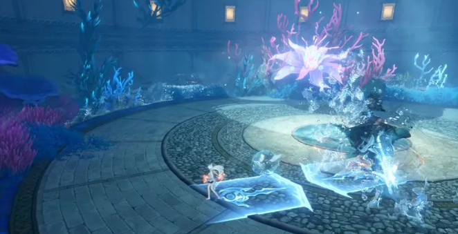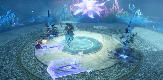 第三種逐潮力量是紫色逐潮——珊瑚之潮。這種技能與前兩種不同,不會形成冰墻,而是在撞擊位置生成崩裂的珊瑚,這些珊瑚能夠摧毀巫陵召喚的“潮鋒巨刃”。成功摧毀潮鋒巨刃后,場地會掉落“珊瑚之勢”增益效果,撿取后,你的角色在下一次使用珊瑚之潮時,爆炸范圍會更大,且對己方的傷害會減少。這項技能特別適合用來摧毀巫陵召喚的強力武器,潮鋒巨刃。在多人戰(zhàn)斗時,優(yōu)先摧毀這些威脅源,可以有效減輕隊友的壓力。