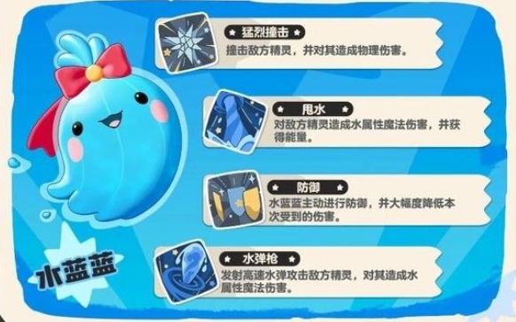 水藍(lán)藍(lán)是一只水系精靈,以小水滴的形象呈現(xiàn),深受許多玩家喜愛。它在攻擊時(shí)可以使用甩水技能,給敵人造成傷害,同時(shí)還有一個(gè)水槍彈技能,可以快速發(fā)射水彈,造成魔法傷害。水藍(lán)藍(lán)的猛烈攻擊技能非常適合物理輸出,此外,它還具有防御技能,能減少所受傷害,增加生存能力。