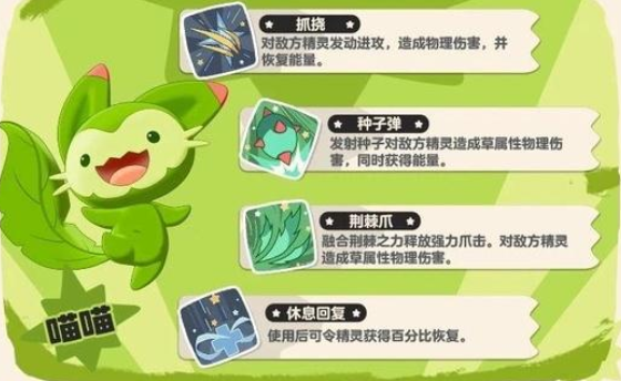 喵喵則是一只草系精靈,外形像一只綠色的小貓,尾巴是由葉子構(gòu)成。它的種子攻擊技能不僅能對(duì)敵人造成物理傷害,還能為自己恢復(fù)能量。荊棘爪技能則能造成強(qiáng)力的草屬性和物理傷害。而抓撓技能則是它的一項(xiàng)基礎(chǔ)攻擊技能,此外,喵喵還有休息技能,能夠回復(fù)生命值,增強(qiáng)其持續(xù)戰(zhàn)斗能力。