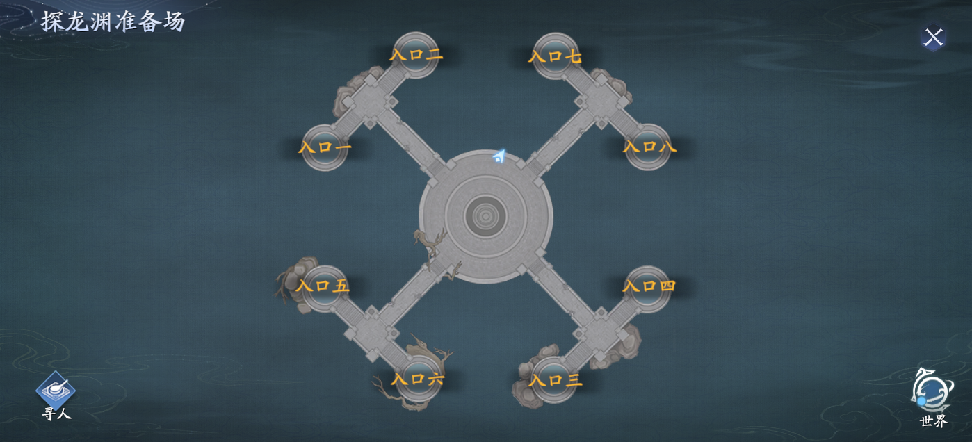 在報名階段,玩家可以點擊游戲主界面中的【日歷】按鈕,進入探龍淵的準備場。此時玩家有5分鐘的時間進行準備,在這段時間內(nèi),玩家可以選擇八個入口中的任意一個進入探龍淵(點擊【進入】按鈕即可快捷選擇)。