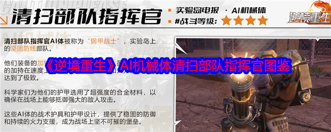 清掃部隊(duì)指揮官AI,亦被稱作“鋼甲戰(zhàn)士”,是實(shí)驗(yàn)島防線中最為強(qiáng)大的守衛(wèi)力量。