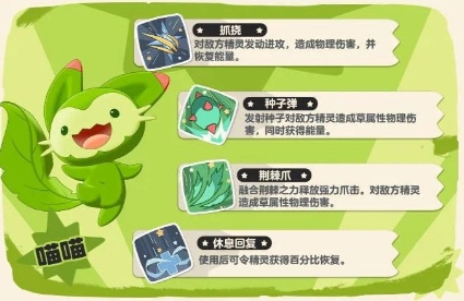喵喵是草屬性的初始寵物,技能多樣,非常適合那些喜歡均衡玩法的玩家。它的種子彈技能不僅可以攻擊敵人,還能為自己恢復(fù)生命值,尤其適合新手玩家,能有效增強(qiáng)生存能力。荊棘爪技能則能夠連續(xù)打擊敵人,非常適合用來應(yīng)對(duì)生命值較高的對(duì)手。