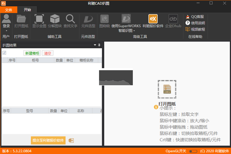 利馳CAD扒圖電腦版是一款高效的CAD圖紙查看與提取工具,界面簡(jiǎn)潔明了,操作簡(jiǎn)單且易于上手,能夠幫助用戶快速瀏覽CAD圖紙、查找信息、提取箱柜或元件內(nèi)容,并導(dǎo)出相關(guān)表格數(shù)據(jù)。該軟件大幅度降低了圖紙打印、輸入和核對(duì)的工作量,極大地提升了工作效率,滿足用戶的日常需求,感興趣的用戶可以嘗試體驗(yàn)。