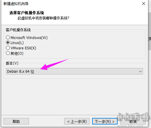 2、選擇“稍后安裝操作系統(tǒng)”,點擊“下一步”,選擇虛擬機支持的Linux版本,例如Debian 8.x,然后點擊“下一步”;