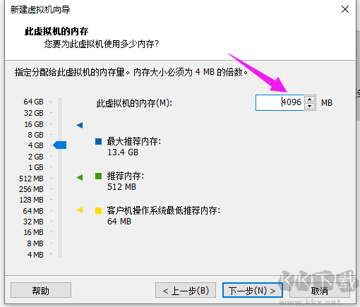 4、分配內(nèi)存,建議不超過推薦的最大內(nèi)存,例如分配4GB,并選擇網(wǎng)絡(luò)連接類型為NAT;