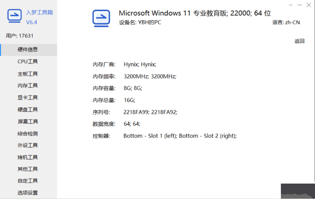 左側(cè)為工具分類(lèi)區(qū),右側(cè)展示各類(lèi)工具。首個(gè)工具是硬件信息,可一鍵復(fù)制至剪貼板,包括內(nèi)存、主板、顯卡、硬盤(pán)等詳細(xì)數(shù)據(jù),點(diǎn)擊各硬件項(xiàng)目還可查看詳細(xì)信息。