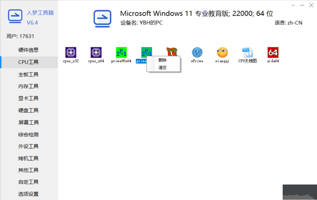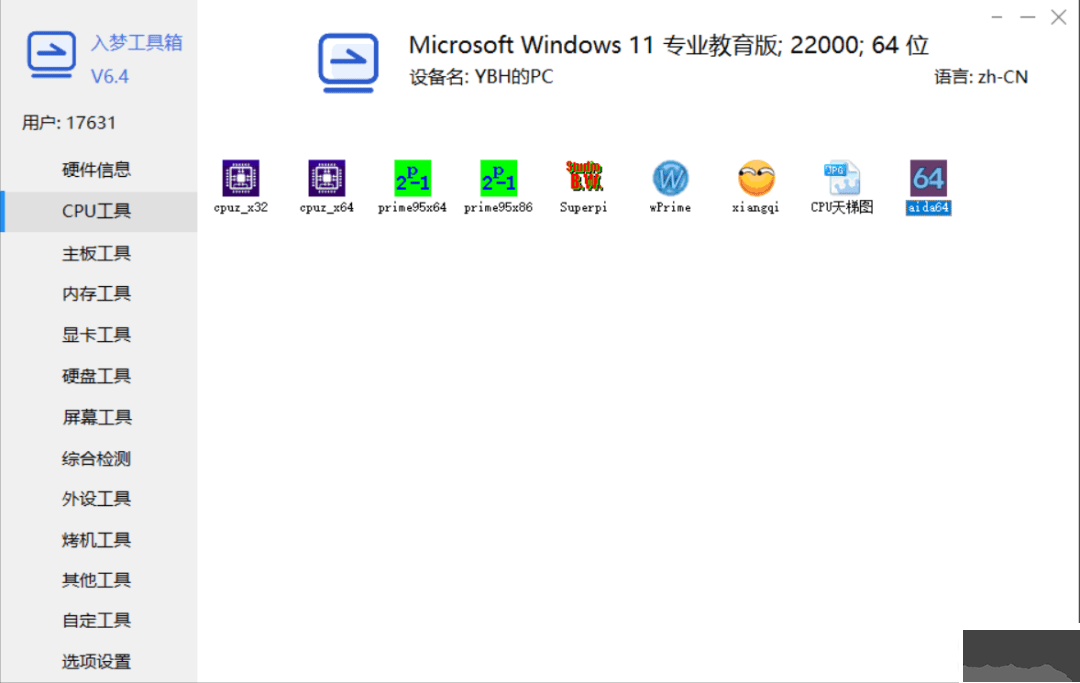 硬件工具涵蓋多種類(lèi)別,總數(shù)超過(guò)80款,如CPU工具9款,簡(jiǎn)便易用,即點(diǎn)即用。
