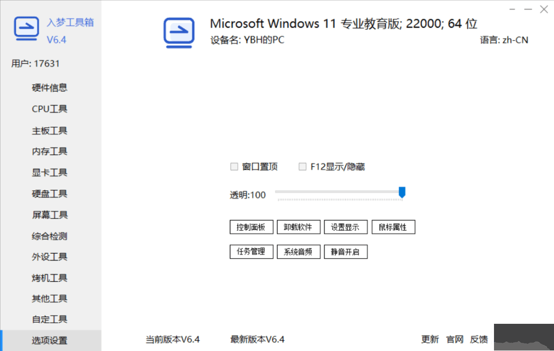 在底部設(shè)置區(qū)域,用戶(hù)可以調(diào)整工具箱的透明度、置頂設(shè)置和快捷鍵設(shè)定。