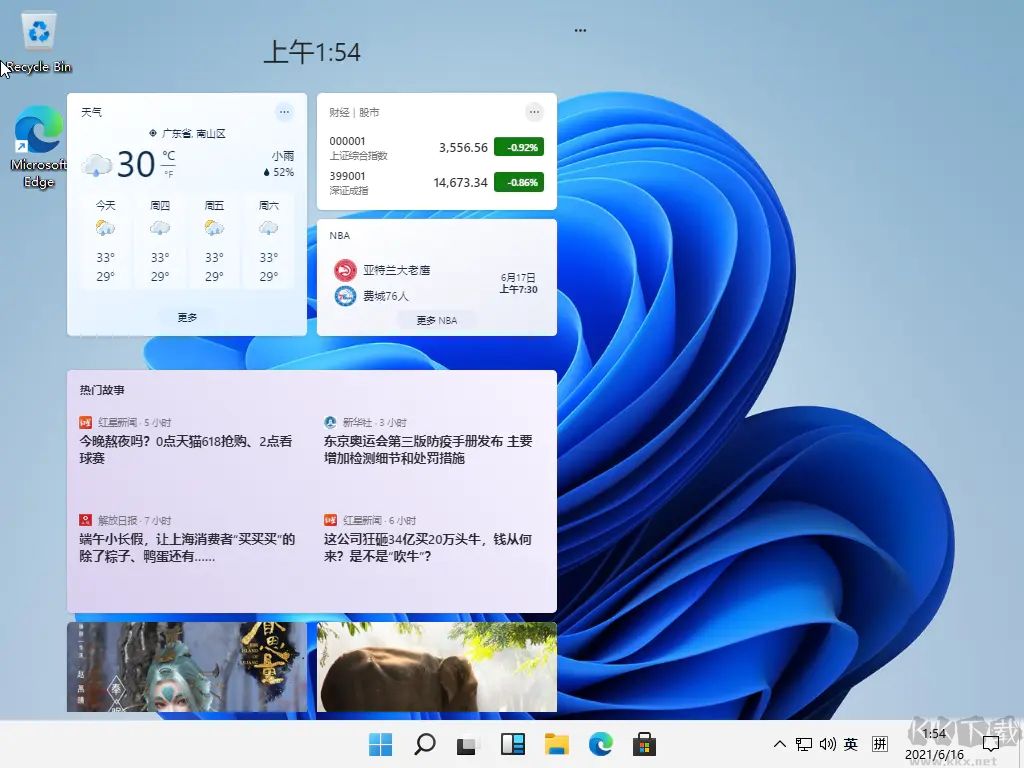 開始菜單和任務(wù)欄經(jīng)過了全新的UI設(shè)計, Windows 11采用圓角設(shè)計,所有圖標(biāo)、應(yīng)用程序、文件資源管理器及控制面板等都使用了圓角,默認(rèn)動態(tài)磁鐵被隱藏,但也可以開啟,加上毛玻璃效果,相比Windows 10顯得更加清爽簡潔。