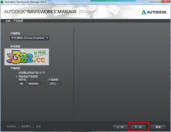 - “我有我的產(chǎn)品信息”(選擇此項(xiàng)),并輸入相關(guān)的 Navisworks 2014 序列號(hào)和密鑰:序列號(hào):066-66666666,密鑰:507F1。