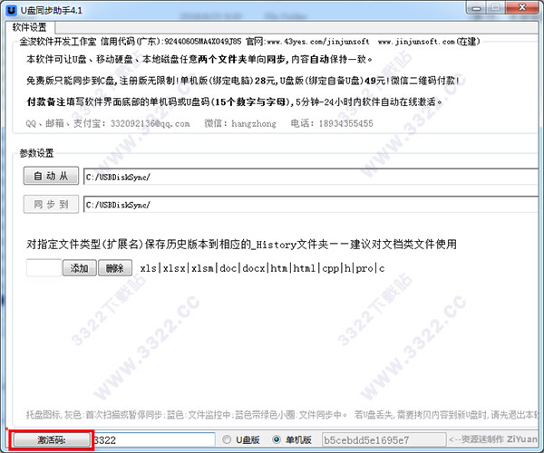1. 綠色版不需要安裝,下載后解壓縮,雙擊“USBDiskSync.exe”運(yùn)行。2. 首次運(yùn)行軟件時,輸入任意激活碼進(jìn)行激活,將獲得正確的激活碼,記錄下這個正確的激活碼后,重新啟動軟件并輸入該激活碼即可完成激活。