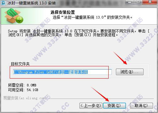 - 選擇程序的安裝路徑,默認(rèn)為C:\Program Files (x86)\冰封一鍵重裝系統(tǒng)??梢渣c(diǎn)擊瀏覽更改路徑,但需確保硬盤有8.0M的空間。