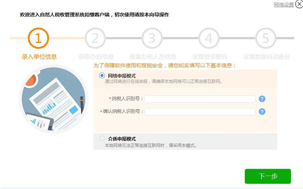 在[納稅人識別號]/[確認(rèn)納稅人識別號]欄中填寫單位稅號,已完成三證合一的單位需輸入社會信用代碼,點(diǎn)擊【下一步】。