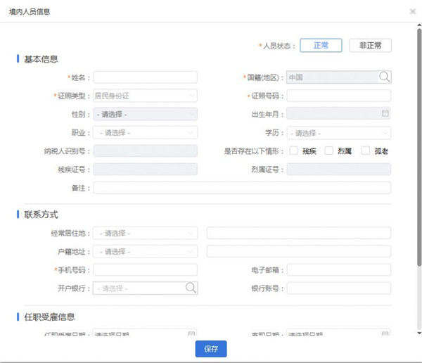 點(diǎn)擊【添加】按鈕,進(jìn)入添加人員界面,正確錄入信息后點(diǎn)擊【保存】完成添加。