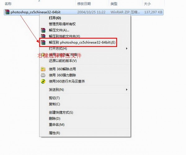 右鍵點(diǎn)擊下載的Photoshop CS5文件包,選擇解壓縮。