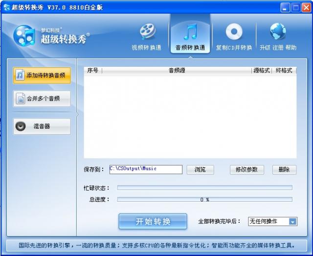超級轉(zhuǎn)換秀是一款全功能的音視頻轉(zhuǎn)換工具,包含視頻轉(zhuǎn)換、音頻轉(zhuǎn)換、CD復制并轉(zhuǎn)換、添加水印等多項強大功能。它的特點是轉(zhuǎn)換速度極快,并且轉(zhuǎn)換后的文件依然保持高質(zhì)量。支持幾乎所有主流視頻文件格式,包括AVI、MPEG1/2/4、VCD/SVCD/DVD、DivX、XVid、ASF、WMV、RM等。內(nèi)置國際頂級解壓技術(shù),確保轉(zhuǎn)換質(zhì)量一流,歡迎需要音視頻文件轉(zhuǎn)換的用戶下載超級轉(zhuǎn)換秀破解版!