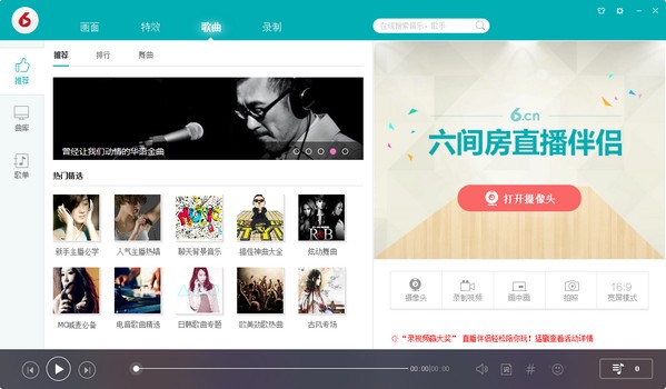 六間房直播伴侶是由六間房官方開發(fā)的專為六間房主播打造的直播工具。該軟件支持成千上萬的用戶進行在線視頻互動、在線K歌、跳舞及視頻交友等活動。自發(fā)布以來,深受廣大直播用戶的喜愛,獨特的640*480高清畫質(zhì)、美膚瘦臉以及畫中畫等創(chuàng)新功能,用戶只需啟動軟件,就可以享受便捷的卡拉OK,輕松選擇歌曲,錄音效果優(yōu)秀,錄制的視頻還能分享給朋友一起觀看!