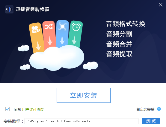 2. 默認安裝路徑為:C:\Program Files (x86)\AudioConverter,您也可以點擊“瀏覽”選擇自定義安裝位置;