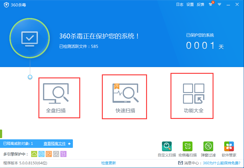 1、下載安裝并打開360殺毒軟件后,主界面將顯示全盤掃描、快速掃描和功能大全三個選項(xiàng),右下角還提供了自定義掃描、宏病毒掃描等特色功能。