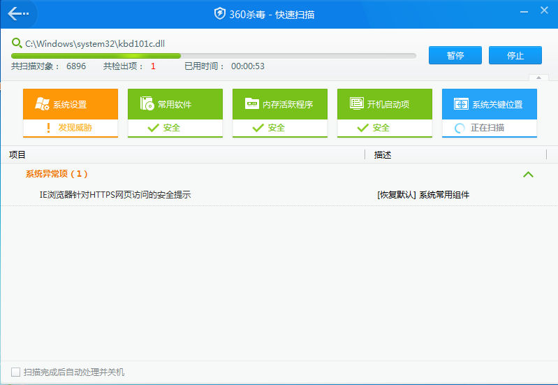 3、選擇快速掃描后,360殺毒會檢查系統(tǒng)設(shè)置、常用軟件、內(nèi)存中活躍的程序等區(qū)域,掃描結(jié)束后,問題將顯示在下方,您可以選擇立即處理,輕松修復(fù)。