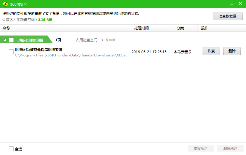 在隔離的文件列表中,找到需要恢復(fù)的文件,選擇后點(diǎn)擊右下角的“恢復(fù)所選”按鈕,文件將被恢復(fù)到原來的保存路徑,您也可以自定義存儲路徑。