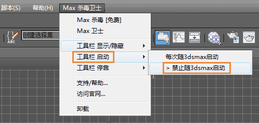⊙ 你也可以設(shè)置Max殺毒衛(wèi)士在啟動時(shí)不再??浚@樣下次可以通過3ds Max頂部菜單啟動。具體步驟如下: