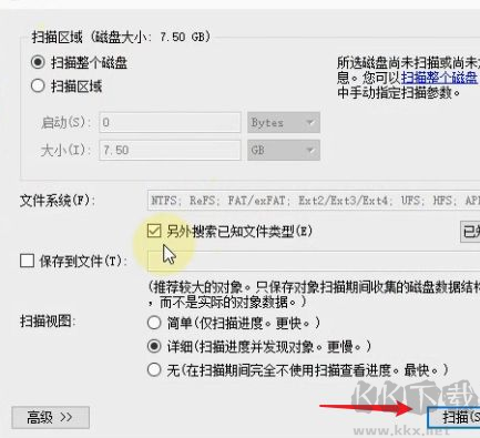 4、彈出掃描設(shè)置界面后,你可以看到磁盤大小,并且在設(shè)置界面的下方選擇不同的掃描視圖:簡易(僅顯示進(jìn)度),詳細(xì)(顯示詳細(xì)掃描信息,速度較慢),無(不顯示任何信息,后臺掃描,速度最快)。根據(jù)你的需求選擇合適的掃描模式。