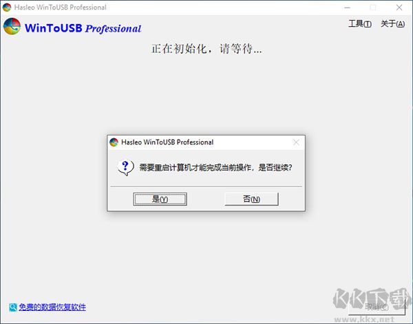 7、WinPE創(chuàng)建完成后,WinToUSB會提示是否重啟電腦。點擊“是”重啟計算機。