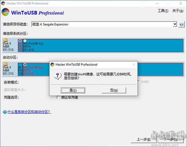 6、點擊“下一步”,WinToUSB會詢問是否創(chuàng)建WinPE環(huán)境,選擇“是”繼續(xù)。