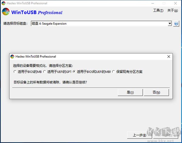 4、WinToUSB會提示是否格式化目標(biāo)USB設(shè)備,以繼續(xù)安裝。選擇合適的分區(qū)方案后點擊“是”進(jìn)行格式化。如果選擇“保留現(xiàn)有分區(qū)方案”,您需要提前手動準(zhǔn)備目標(biāo)設(shè)備的分區(qū)。請注意,“保留現(xiàn)有分區(qū)方案”僅適用于移動硬盤。
