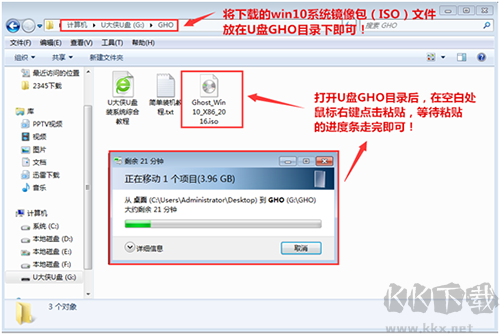 注意:有時制作完成后,U盤中的GHO目錄可能無法顯示,或出現(xiàn)需要格式化U盤的提示。這時需要將已下載的系統(tǒng)鏡像文件復制到U盤的GHO文件夾中,具體操作如圖所示: