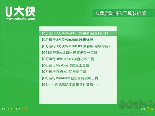 將制作好的U大俠啟動U盤插入電腦的USB接口,重啟電腦。在開機畫面出現(xiàn)時,使用對應的快捷鍵進入U大俠主菜單。由于不同品牌的電腦啟動快捷鍵不同,建議根據(jù)主板型號查找具體的啟動快捷鍵,便于快速進入U大俠PE系統(tǒng)界面。